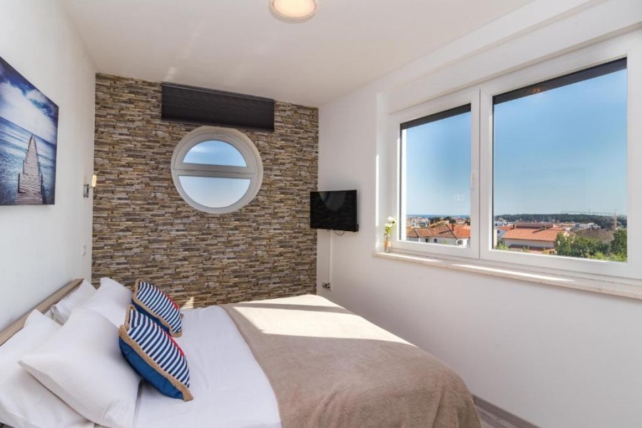und Apartment mit Meerblick, Schlafzimmer, Wohnzimmer + Küche und Badezimmer.