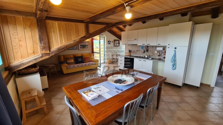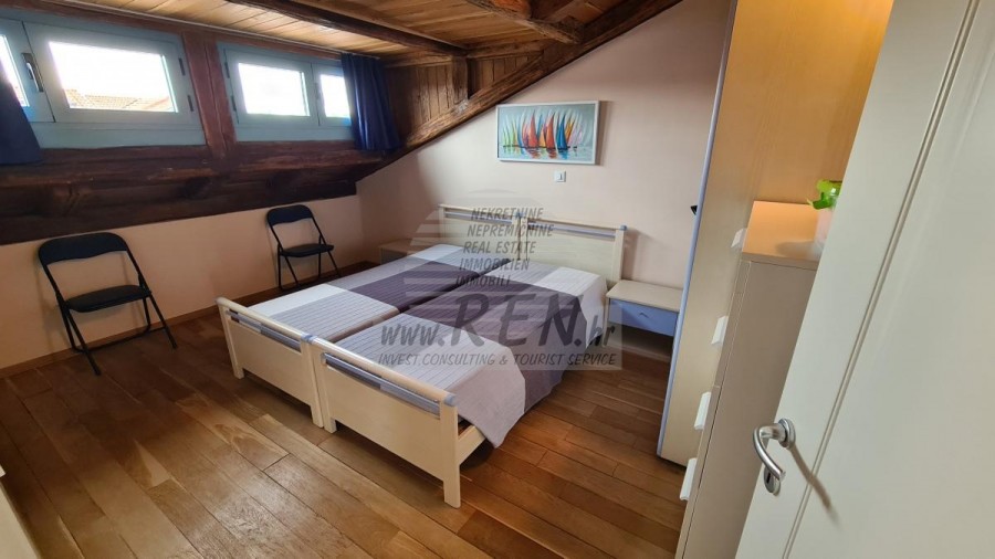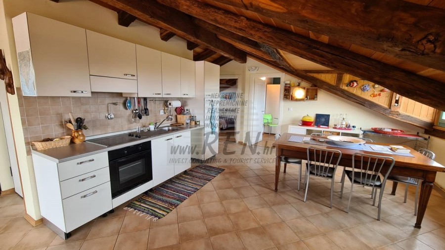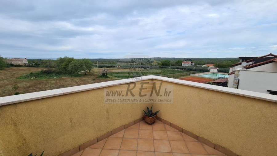 Die Wohnung hat eine Gesamtfläche von 91,33 m2, liegt im Dachgeschoss, Baujahr 2012, nur 5 Min. (5000 m) vom Meer und den schönen Stränden entfernt, 10 Min. (6000 m) vom Zentrum von Poreč entfernt. Die Wohnung besteht aus einem Flur, einer Küche/Esszimmer, einem Wohnzimmer, 2 Schlafzimmern, einem Badezimmer und einer Terrasse. Ausgestattet mit Klimaanlage, privatem Parkplatz, wunderschönem Meerblick. Die Möglichkeit, den Tennisplatz und das Schwimmbad zu nutzen.