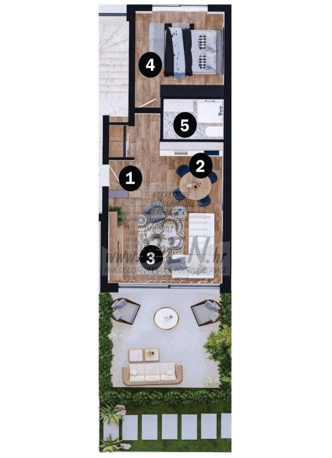 Wohnung mit einer Gesamtfläche von 45,52 m2, Garten 8 m2, nur 5 Min. (100m) vom Meer und von wunderschönen Natursteinstränden, 10 Min. (6000 m) vom Zentrum von Umag entfernt. Die Wohnung befindet sich im Erdgeschoss. Im Aufbau. Insgesamt gibt es 1 Schlafzimmer, Küche, Wohnzimmer, Badezimmer, Abstellraum. Die Wohnung verfügt über 1 eigenen Parkplatz, Terrasse, Kamin, Klimaanlage, luxuriös ausgestattet. In einem privaten Resort mit Rezeption, Möglichkeit zur gemeinsamen Nutzung von Fitnessstudio, Wellness, Kinderspielplatz, Weinbar, 24-Stunden-Betreuung, Ladestation für Elektroautos, Wartungspakete für die Anlage verfügbar.